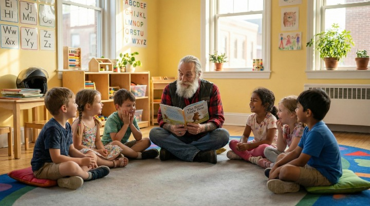 At Jefferson Elementary, every Tuesday, Harold Mercer—a towering man with a gray beard, tattoos, and a Harley—reads to Mrs. Patterson’s first graders. The kids adore him, laughing at his funny voices.