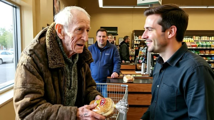 After a long shift, I stopped at the grocery store—exhausted, divorced, and juggling life as a mom of two teens. Ahead of me in line was an elderly man buying only bread, milk, and peanut butter. When his card was declined, the line groaned. He quietly offered to put the items back.
