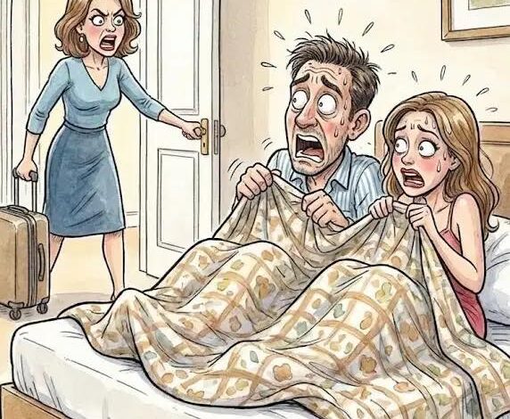 A wife came home from a long shopping trip and was shocked to find her husband in bed with a young, attractive woman.