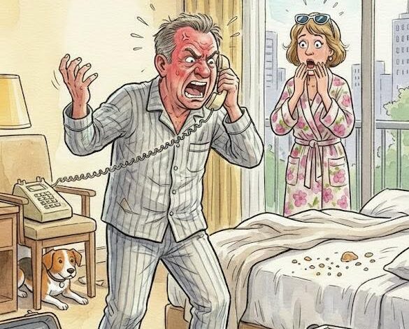 A man calls the hotel front desk, and the clerk answers politely, asking how they can help. The man explains he’s in room 858 and urgently needs assistance because he’s arguing with his wife, who’s threatening to jump out the window. The clerk responds that it sounds like a private issue. Frustrated, the man snaps back, saying the window won’t open—and that makes it a maintenance problem.