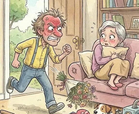 He burst through the door and found Grandma lying on the sofa, hugging her pillow. He tossed the flowers to the floor and demanded,