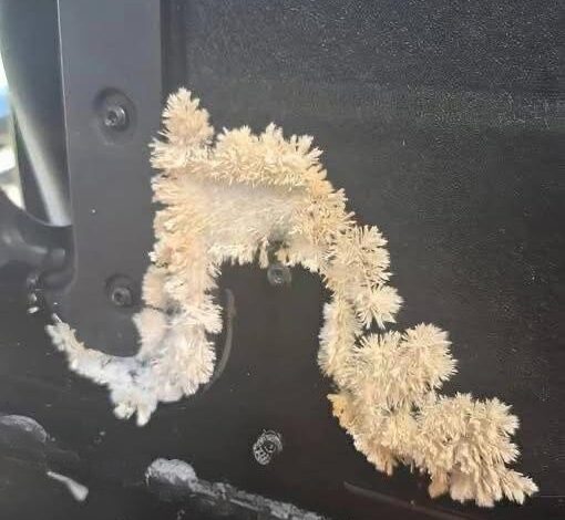 Up close, it appeared crystalline and coral-like, releasing fine particles when touched. Concerned it could be mold or fungus, I shared photos online, where warnings quickly poured in. An environmental safety expert advised me not to touch it again, explaining it was likely crystalline mold caused by trapped moisture, potentially harmful if inhaled.