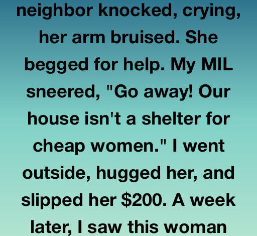 When my bruised, pregnant neighbor knocked on my door crying, I didn’t hesitate to help—despite my mother-in-law’s cruel words. I gave her money and comfort, believing she was escaping domestic abuse.