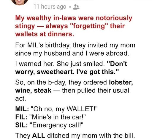 My wealthy in-laws loved ordering expensive meals but never paid the bill. When they invited my mom to dinner, she knew their trick—and handled it with class.