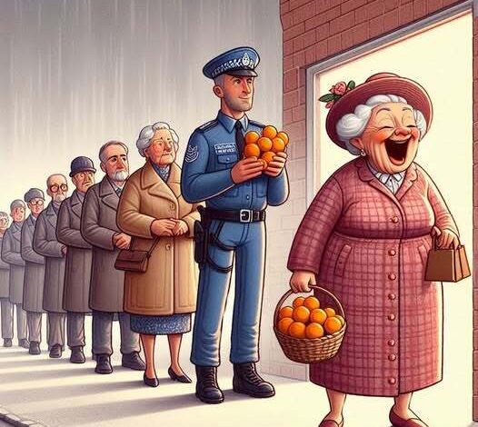 Susie worked somewhere she didn’t want her Gran to know about. One day, the police raided the building, lining everyone up outside—just as Gran walked by! Thinking fast, Susie whispered, “Gran! It’s a queue for free oranges!” Gran happily joined the line. When an officer asked how she managed at her age, she proudly said, “Oh, easy! I just take my teeth out, peel back the skin, and suck ’em dry!”