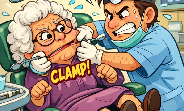 An elderly patient panicked at the dentist, clamping her mouth shut every time he tried to work.