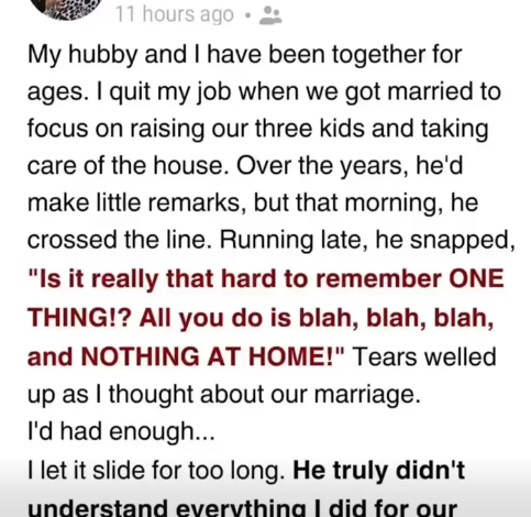 After 15 years of dedicating her life to raising three children and keeping her family together, Sara was cruelly told by her husband, Harry, that she “did nothing all day.” One small mistake triggered a heartbreaking argument that pushed her beyond her limits, causing her to collapse from overwhelming stress. Instead of showing remorse, Harry walked away and filed for divorce—leaving Sara to rebuild her life from the ground up.
