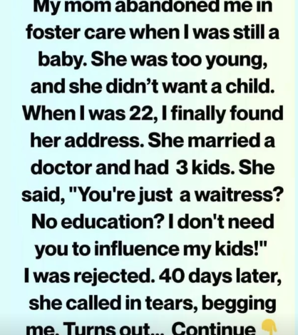 At 22, I found her. When she opened the door, she barely recognized me. Behind her were photos of the family she built without me. When I told her I was a waitress, she said, “You’re just a waitress? I don’t want you near my kids.” Then she shut the door.