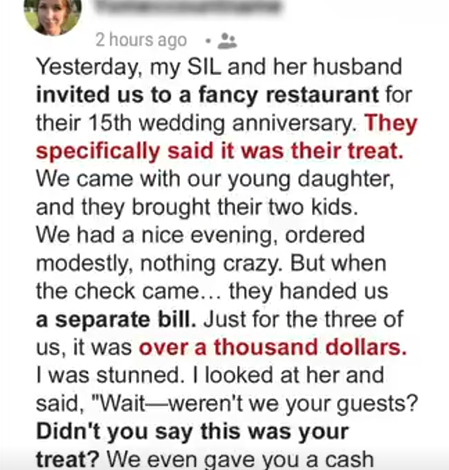 The next day, I posted the receipt and wrote: “Modern etiquette: invite guests, then bill them. #LessonLearned.” The post went viral. She begged me to delete it — I refused.