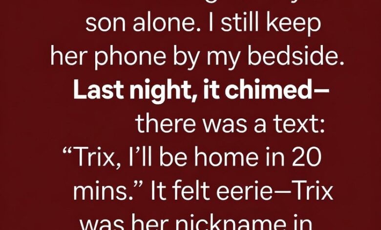 One night, her phone chimed. A message appeared: “Trix, I’ll be home in 20 mins.” My heart froze—Trix was her nickname for me in college. The text wasn’t new; it was an unsent draft from the night she never came home.