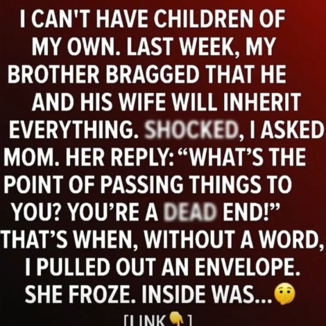 I can’t have children. Last week, at a family dinner, my brother smugly declared he and his wife would inherit everything from our parents, as if having kids made him more deserving.