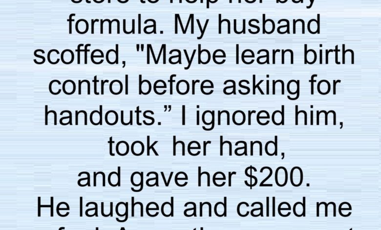 In a grocery store aisle, a young mother begged for help buying baby formula while her newborn cried in her arms. My husband laughed and mocked her.