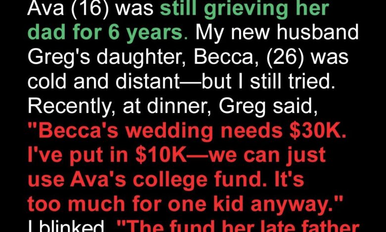 Six years after my remarriage, my husband Greg suggested we dip into my late husband David’s college fund for our daughter Ava (16) to pay for his adult daughter Becca’s wedding. I was stunned. That fund was David’s final gift to Ava — her future, her dreams.