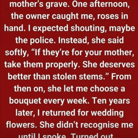 When I was twelve, I used to take flowers from a small shop and leave them at my mother’s grave. I had no money, but it made me feel close to her. One day, the shop owner caught me. Instead of anger, she said gently, “If they’re for your mother, take them the right way.”