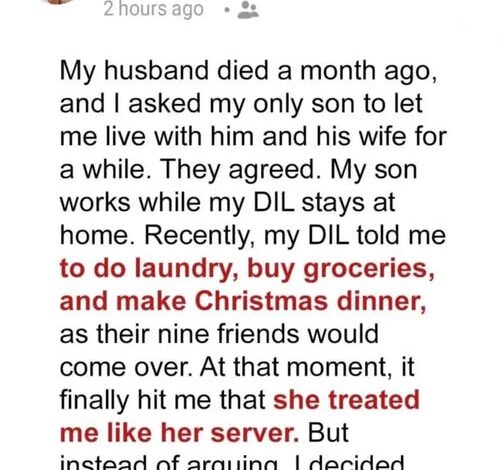 After my husband Ron passed away, I moved in with my son Connor and his wife Eve, hoping retirement would bring peace—not loneliness. At first they welcomed me warmly, but over time small favors turned into endless chores until I realized I had become their full-time maid instead of family. When Eve casually ordered me to cook Christmas dinner for nine guests, I decided to respond without an argument—by preparing a flawless holiday feast that reminded everyone exactly who I was. That night, my daughter-in-law finally saw how much she had taken for granted, apologized sincerely, and from then on I was treated not as the housekeeper, but as family.
