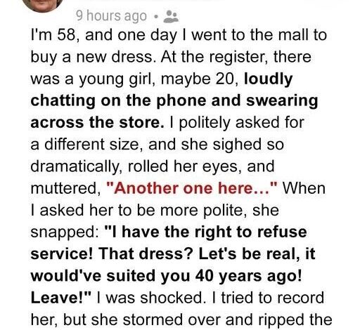 I went shopping for a dress for my son’s wedding—and ended up being humiliated by a rude young store clerk who mocked me and even snatched my phone from my hands.
