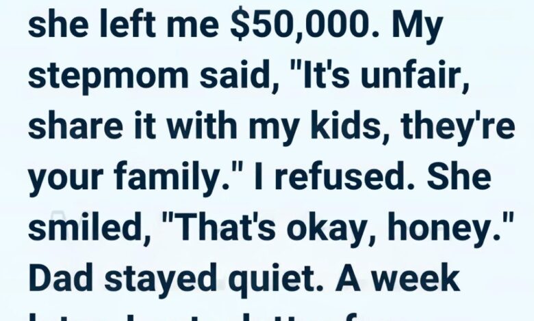 But soon after, my stepmom confronted me, insisting the money should be shared with my step-siblings because “we’re family.” My dad stayed silent—but I didn’t realize that silence had a cost.