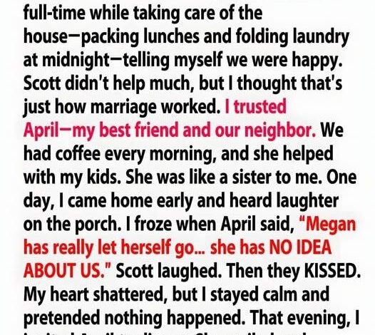 After 12 years of marriage, Megan believed she had a stable life—until she came home early one day and overheard her husband Scott and her best friend April on her back porch. What she heard shattered her trust: betrayal, lies, and a hidden affair right under her nose.