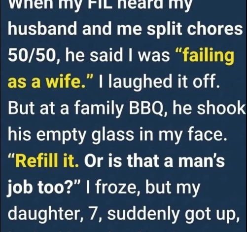 When my father-in-law made a sarcastic comment about how we share chores at home, I stayed quiet—even though it stuck with me. A week later at a family barbecue, he pushed again, handing me his glass with another remark meant to test my patience.