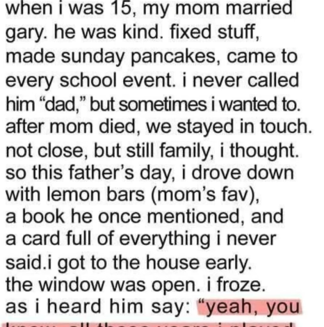 On Father’s Day, I brought lemon bars, a WWII book, and a heartfelt card for Gary—the man who stepped in after my father left. He had always been steady and present, even if I never called him “Dad.” At 25, I was finally ready to thank him.