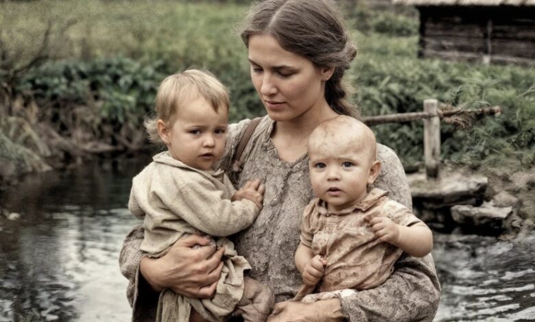 Alyona froze at the sink, sensing something was wrong. Maria revealed two babies, a boy and a girl, wrapped in blankets. “I found them in the old well…” she whispered. Alyona, stunned, took the cold, dirty child in her arms. They had been abandoned, and no one in the village knew who their parents were.
