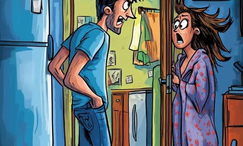 Fuming, he picks up the refrigerator (because apparently, that’s the logical next step) and throws it out the window. He has a heart attack from all the excitement and drops dead.
