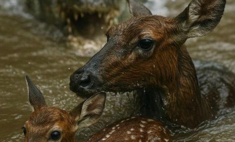 I work in wildlife rescue—mostly remote tracking and observation. It’s not glamorous, but I love it. One stormy day, while monitoring a doe and her fawn, I watched in horror as rising floodwaters trapped them. Then I saw a crocodile approaching. With only seconds to act and one rope, I made an instinctive choice: I saved the fawn.