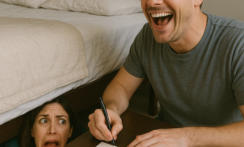 Furious and sobbing, the wife wiggles out from under the bed like an angry dust bunny. She grabs the note to see what he dared to write.