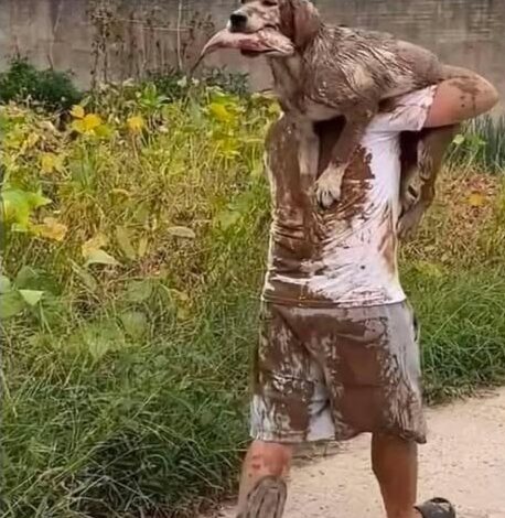 A now-viral photo shows a man covered head-to-toe in mud, carrying an equally filthy dog on his shoulders. In the dog’s mouth? A fresh fish, held proudly like a trophy.