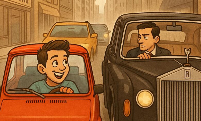 A guy driving a Yugo pulls up at a stoplight next to a Rolls-Royce