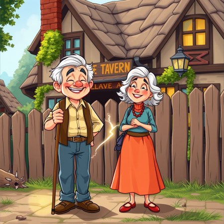 The couple, leaning on each other and their canes, slowly makes their way behind the tavern. When they reach the old fence, she lifts her skirt, and he drops his pants. She braces herself, and he moves in.