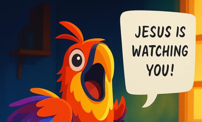 The parrot smirked, “The same one who named the Rottweiler Jesus.”