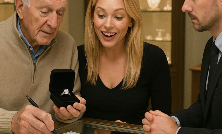 The clerk presents a ring priced at $50,000. The woman responds that it’s nice but wants something even more impressive. After another nod from the man, the clerk reveals a top-tier ring worth over $300,000. The woman loves it and decides to buy it. The old man writes a check, and the clerk explains that because of the high amount, it will take three days to clear, so they should return Monday to collect the ring.
