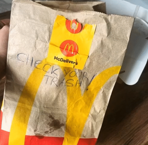 Puzzled, I noticed a shaky message on the back of the takeout bag: “CHECK YOUR TRASH CAN.”