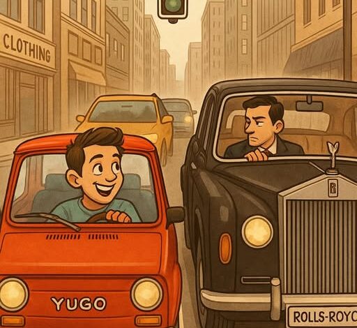 A guy driving a Yugo pulls up at a stoplight next to a Rolls-Royce
