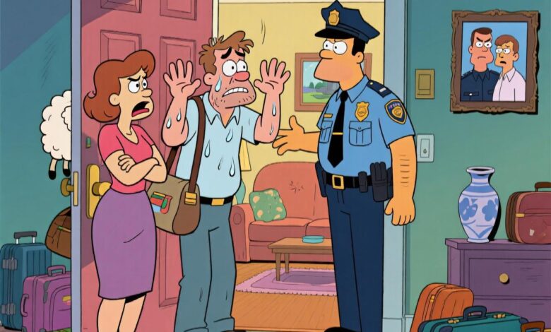 Now he’s not only locked out of the house—he’s considering calling the police for an escort just to step inside without getting hit by a flying slipper.