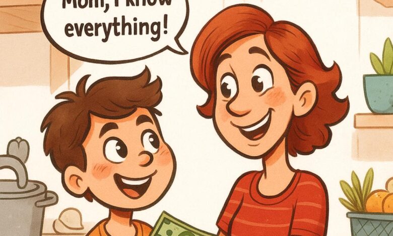 Excited to try it, Johnny goes home. When his mom greets him, he says, “I know the whole truth.” She quickly hands him $20 and warns, “Don’t tell your dad.”