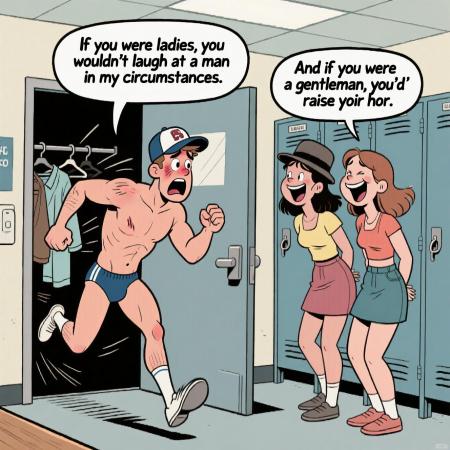 A fit young man, always wearing his baseball cap, was on his way to the steam room at a gym when he noticed someone walking off with his clothes. Wearing nothing but his hat, he chased after the thief. On his way out of the locker room, he ran into two girls who laughed at him.