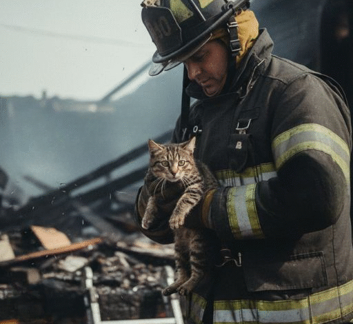 The call came—house fire, lives possibly at risk. Inside, through smoke and flames, I heard a cry. Not a person—a cat. I bundled her in my jacket and carried her out.