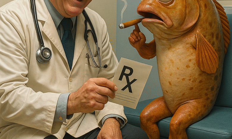The fish sighs, “Honestly, everything. My back hurts, I’ve caught a cold, my vision’s getting worse, and my blood pressure’s sky-high.”