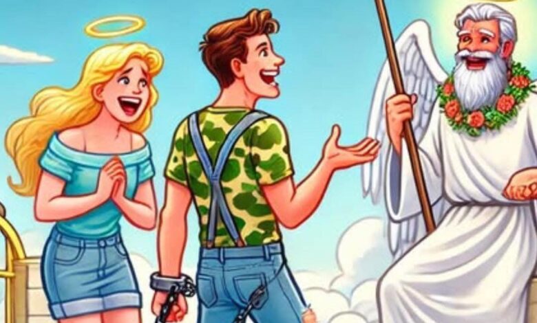 The chains vanish. Free, they choose each other. Walking together, a QUACK surprises them—St. Peter holds a duck, grinning: “Just keeping you humble.”